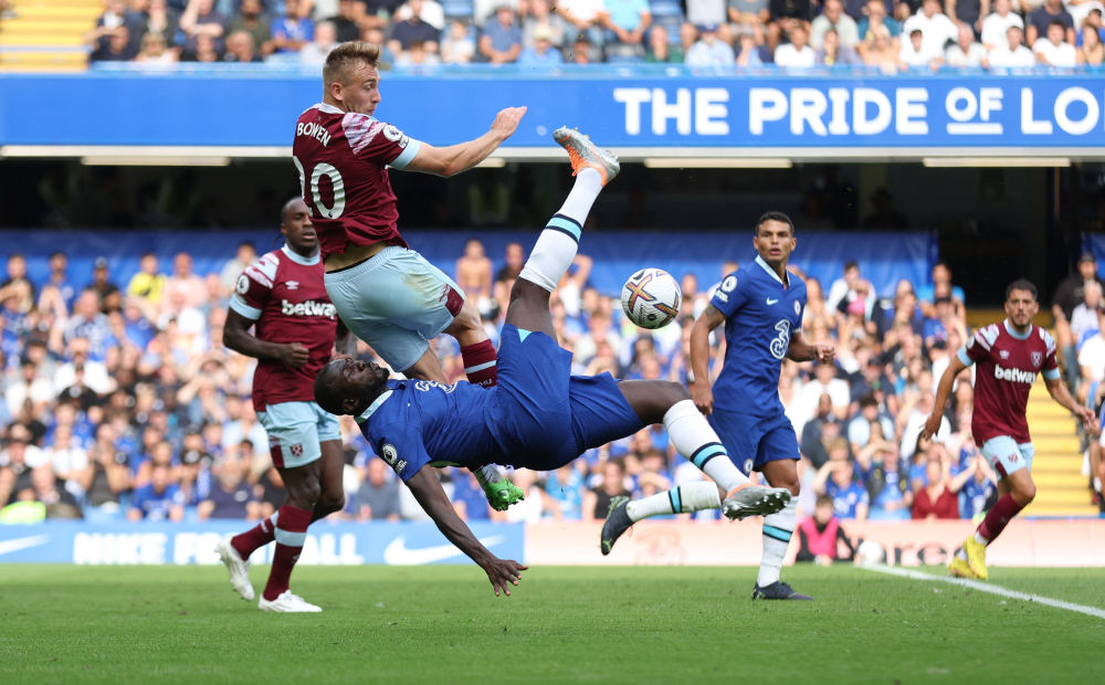 9月3日,切尔西队球员库利巴利(前下)与西汉姆联队球员鲍恩(前上)在比赛中拼抢。新华社/路透