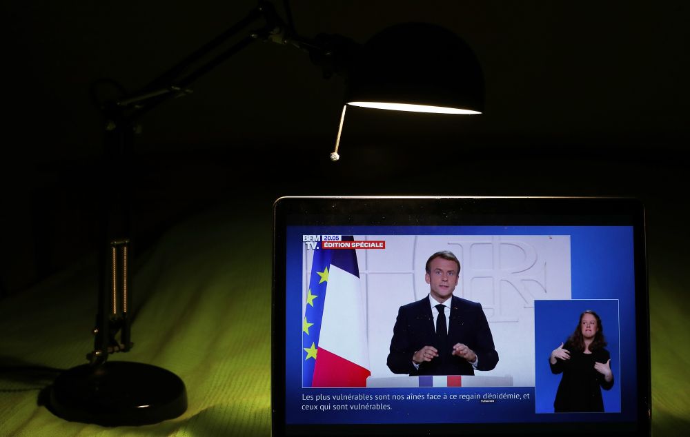这是2021年11月9日在法国巴黎拍摄的法国总统马克龙就法国能源供给和新冠疫情防控等问题发表电视讲话的直播画面。马克龙在讲话中表示,法国计划重启境内的核反应堆建设。(新华社记者高静 摄)