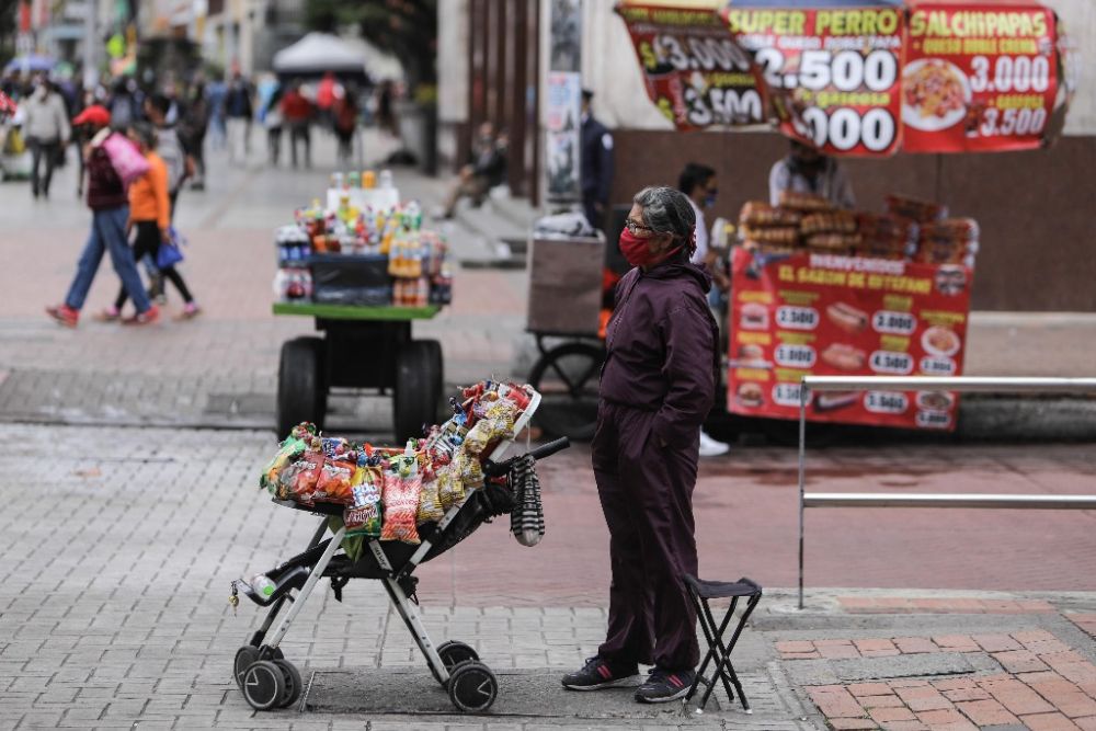 2020年10月24日,戴着口罩的商贩在哥伦比亚首都波哥大等待顾客。新华社发(约翰·帕斯摄)