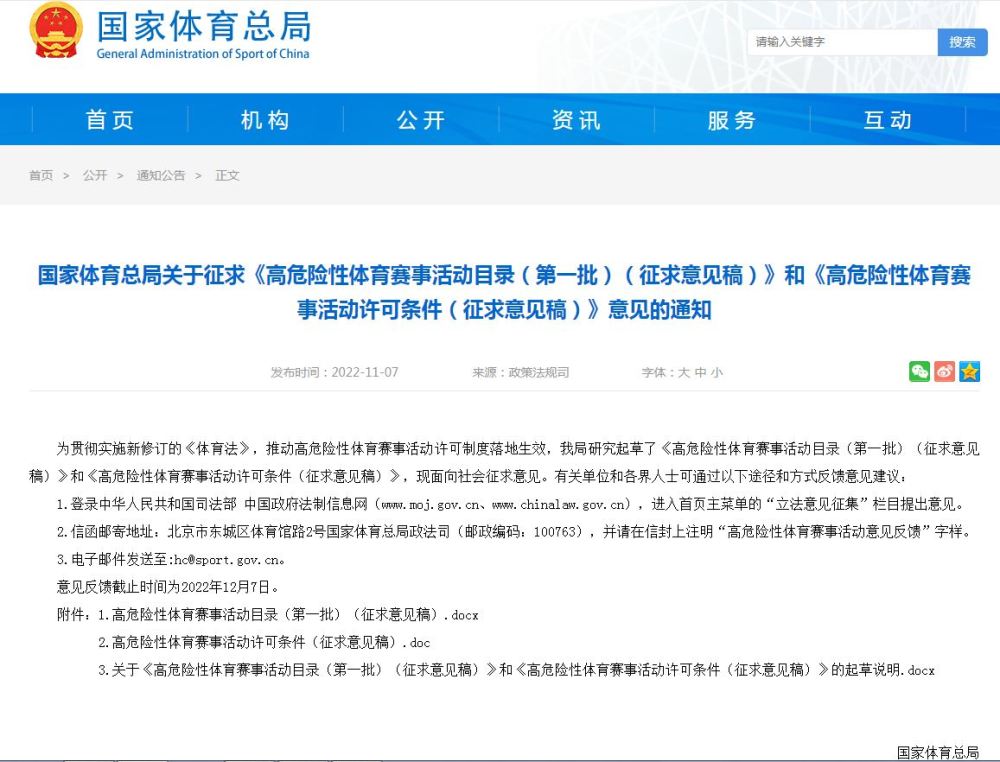 国家体育总局在当天发布的通知中写道:“为贯彻实施新修订的《体育法》,推动高危险性体育赛事活动许可制度落地生效,我局研究起草了《高危险性体育赛事活动目录(第一批)(征求意见稿)》和《高危险性体育赛事活动许可条件(征求意见稿)》,现面向社会征求意见。”