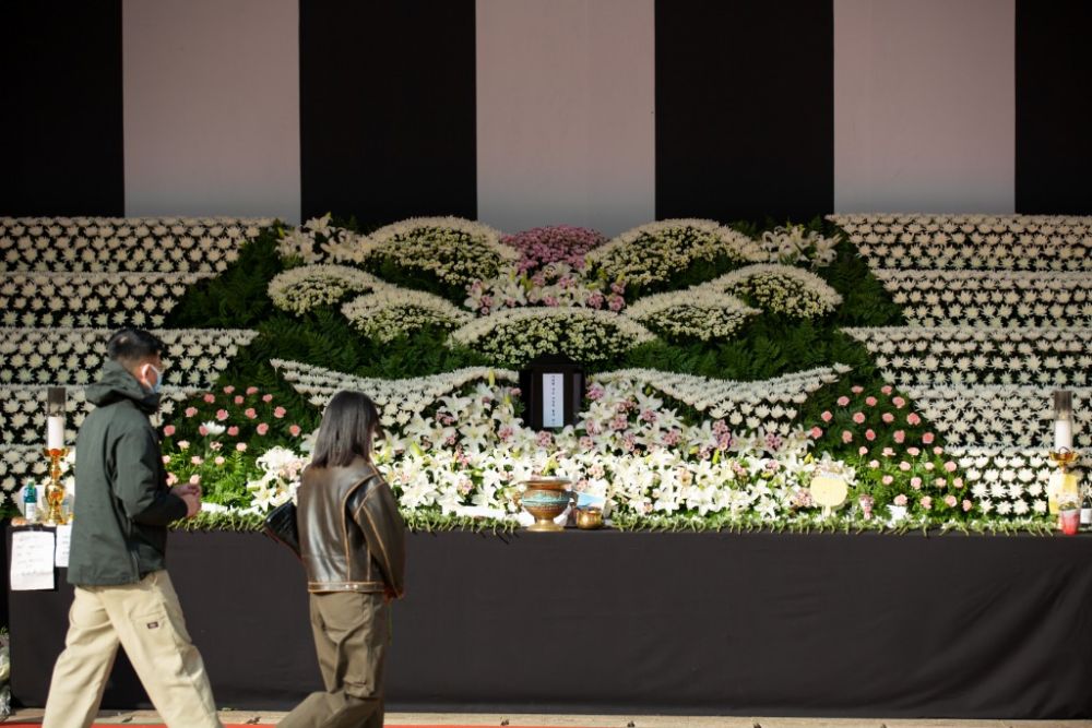 11月1日,民众走进设在韩国首尔广场首尔图书馆正门前的集体焚香所,为遇难者献花默哀。(新华社记者王益亮摄)