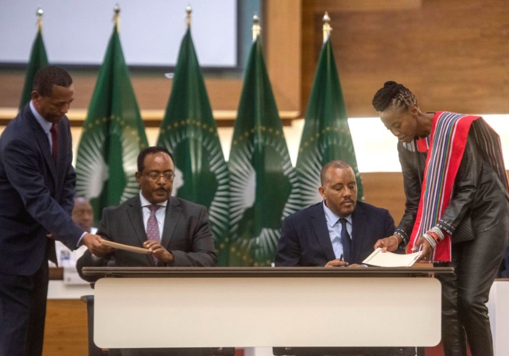 11月2日,埃塞俄比亚政府代表拉迈托(左二)与“提格雷人民解放阵线”(“提人阵”)武装代表雷达(右二)在南非比勒陀利亚签署停火协议。新华社发(阿列特·比勒陀利乌斯摄)