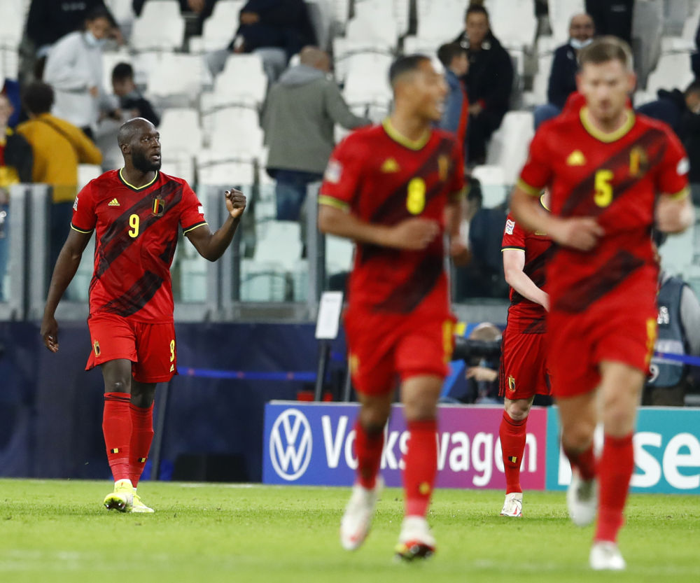 2021年10月7日,比利时队球员卢卡库(左)在比赛中庆祝进球。新华社发