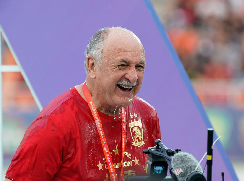 图为2017年11月4日,广州恒大队实现联赛七连冠,时任球队主教练斯科拉里在颁奖仪式上笑逐颜开。新华社记者刘大伟摄