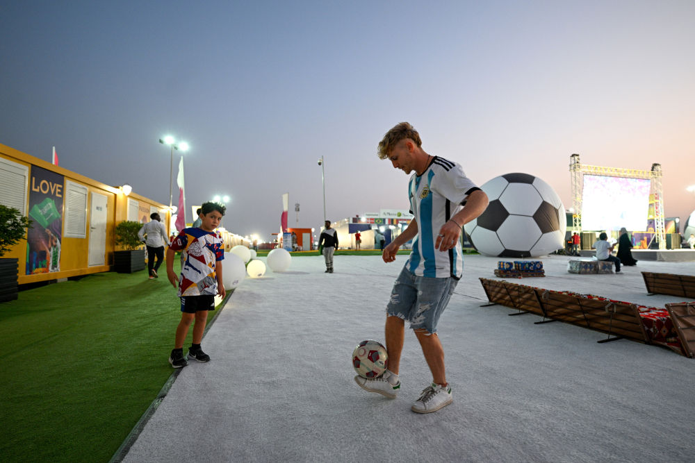 11月20日,球迷在卡塔尔多哈的一处球迷村里踢球。新华社记者 辛悦卫 摄