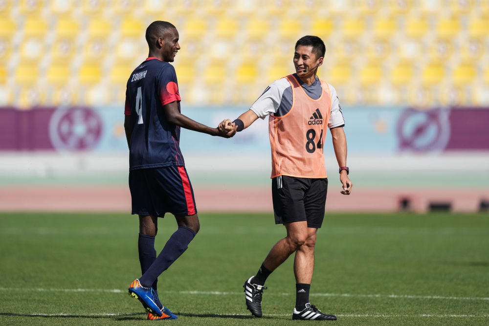 11月18日,中国裁判马宁(右)在卡塔尔世界杯训练中。新华社记者 潘昱龙 摄