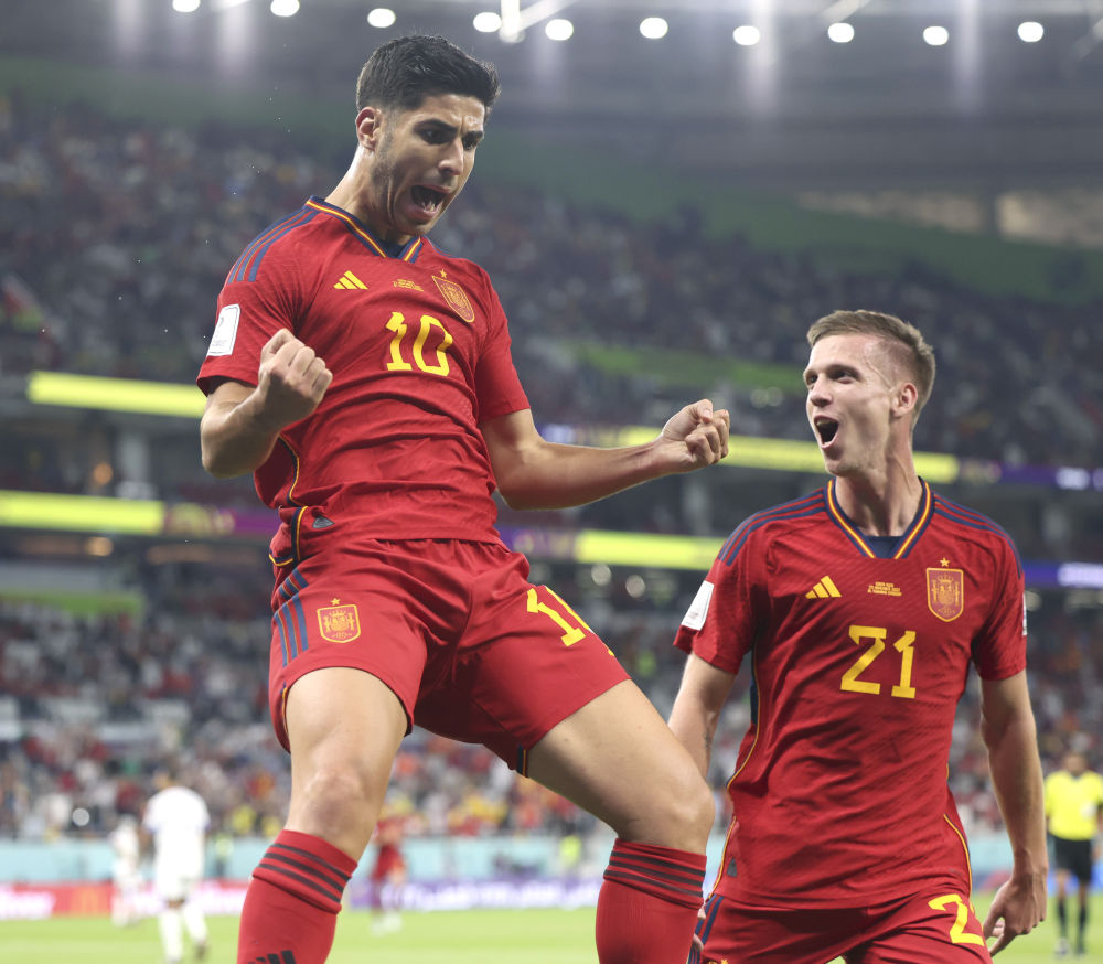 11月23日,西班牙队球员在比赛中进球后庆祝。新华社记者 李明 摄