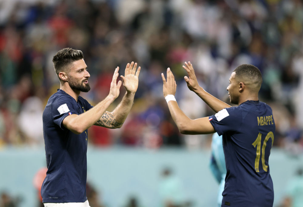 11月22日,法国队球员吉鲁(左)与队友姆巴佩庆祝进球。新华社记者李明摄