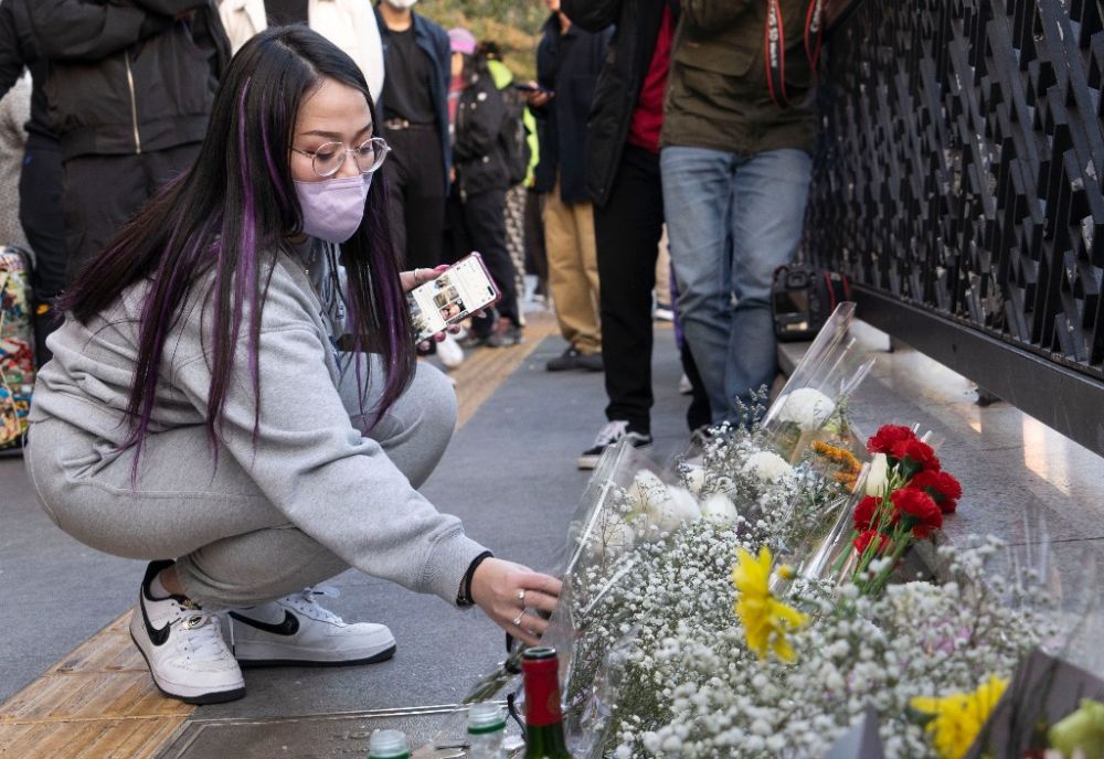 10月30日,民众在韩国首尔市龙山区梨泰院洞一带悼念踩踏事故遇难者。新华社发(李相浩摄)