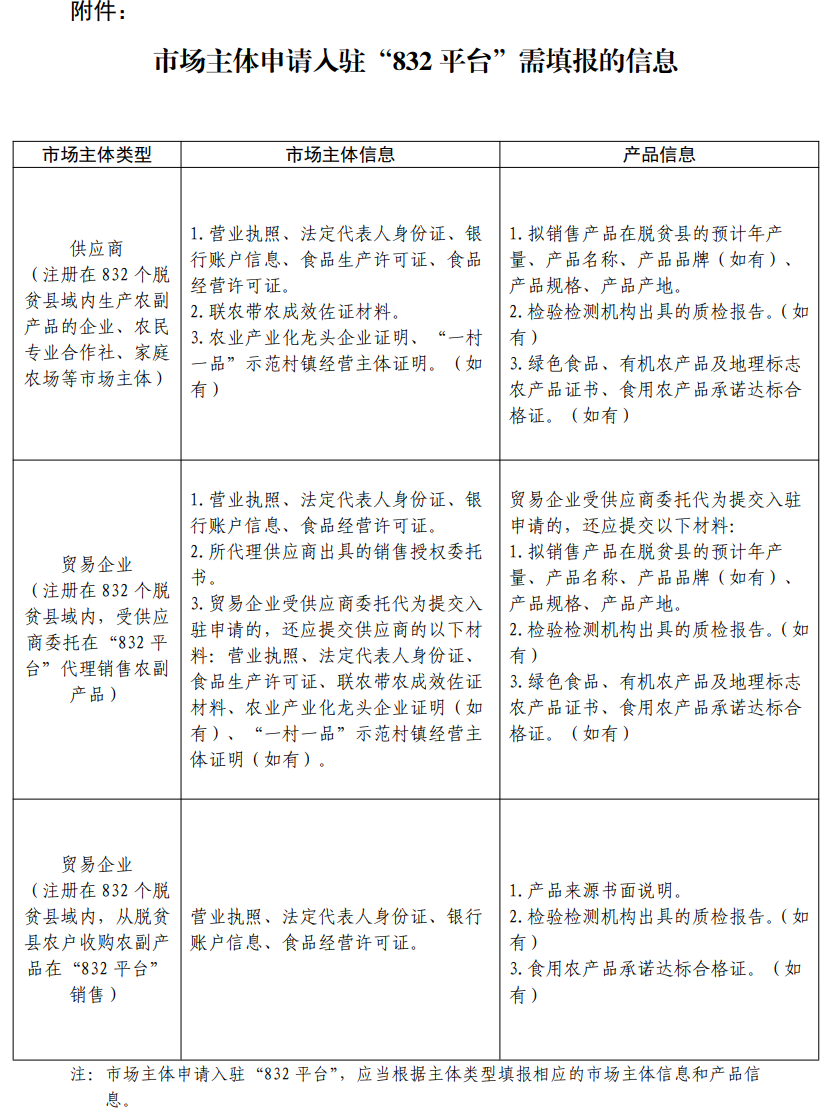 (一)供应商申请。供应商通过“832平台”供应商审核推荐管理系统(gy.fupin832.com,以下简称管理系统)在线提交入驻申请,按要求填写市场主体信息、产品信息。