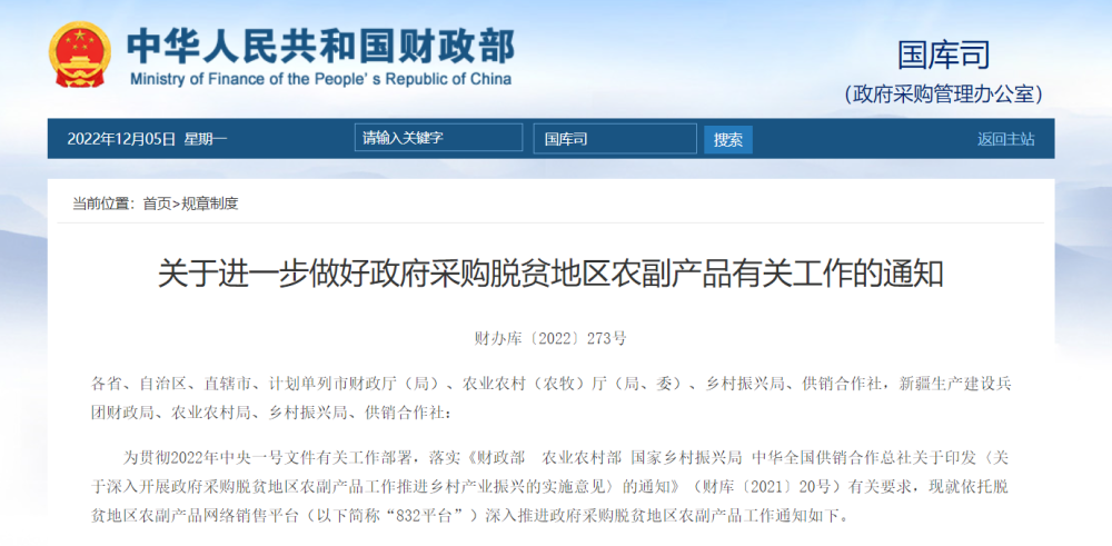 为贯彻2022年中央一号文件有关工作部署,落实《财政部 农业农村部 国家乡村振兴局 中华全国供销合作总社关于印发〈关于深入开展政府采购脱贫地区农副产品工作推进乡村产业振兴的实施意见〉的通知》(财库〔2021〕20号)有关要求,现就依托脱贫地区农副产品网络销售平台(以下简称“832平台”)深入推进政府采购脱贫地区农副产品工作通知如下。