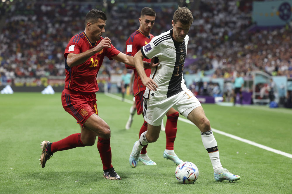 ↑西班牙队球员罗德里(左)与德国队球员托马斯·穆勒(右)在比赛中拼抢。新华社记者 曹灿 摄