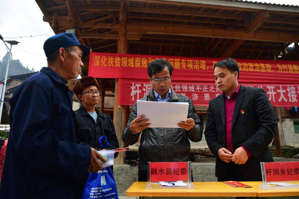 在广西融水苗族自治县杆洞乡乌英苗寨,纪检监察干部(右一、右二)在了解扶贫产业补助资金的落实情况(2019年11月16日摄)。新华社记者 黄孝邦 摄