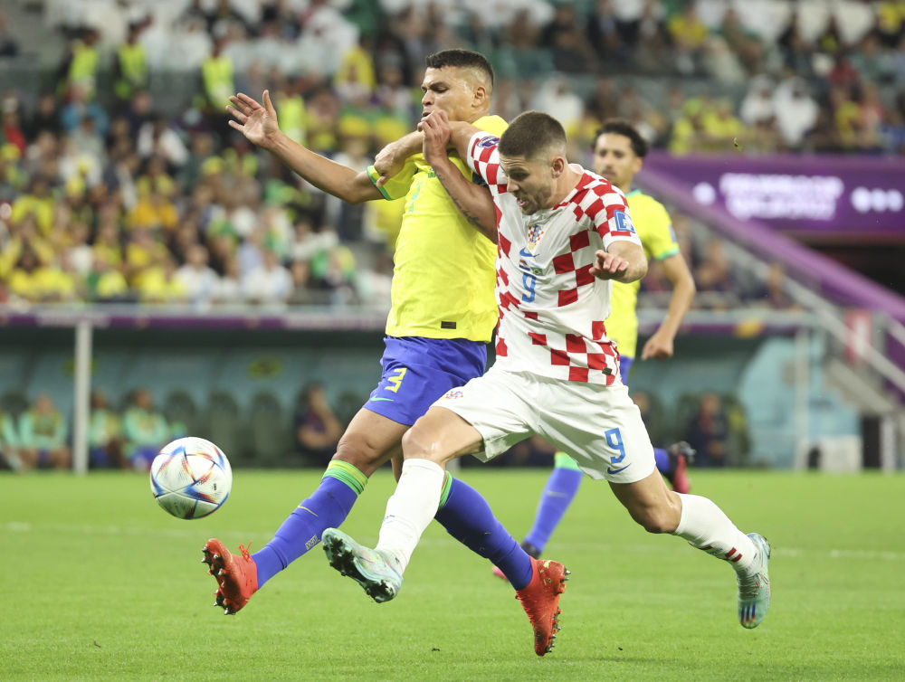 12月9日,巴西队球员蒂亚戈·席尔瓦(左)与克罗地亚队球员克拉马里奇在比赛中拼抢。新华社记者 韩岩 摄