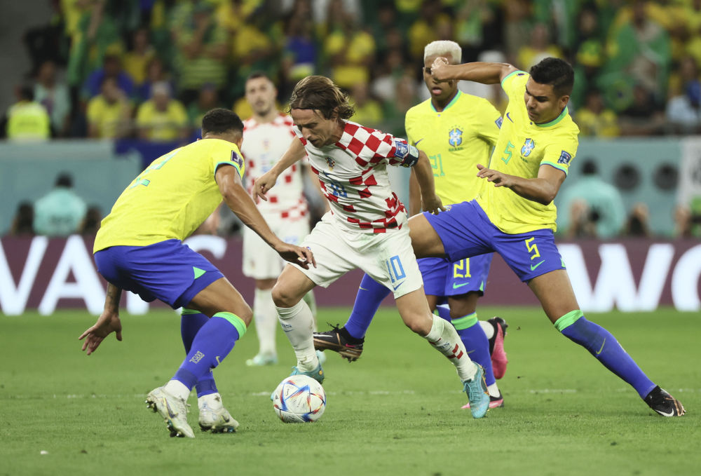 12月9日,克罗地亚队球员莫德里奇(左二)与巴西队球员卡塞米罗(右一)在比赛中拼抢。新华社记者 兰红光 摄