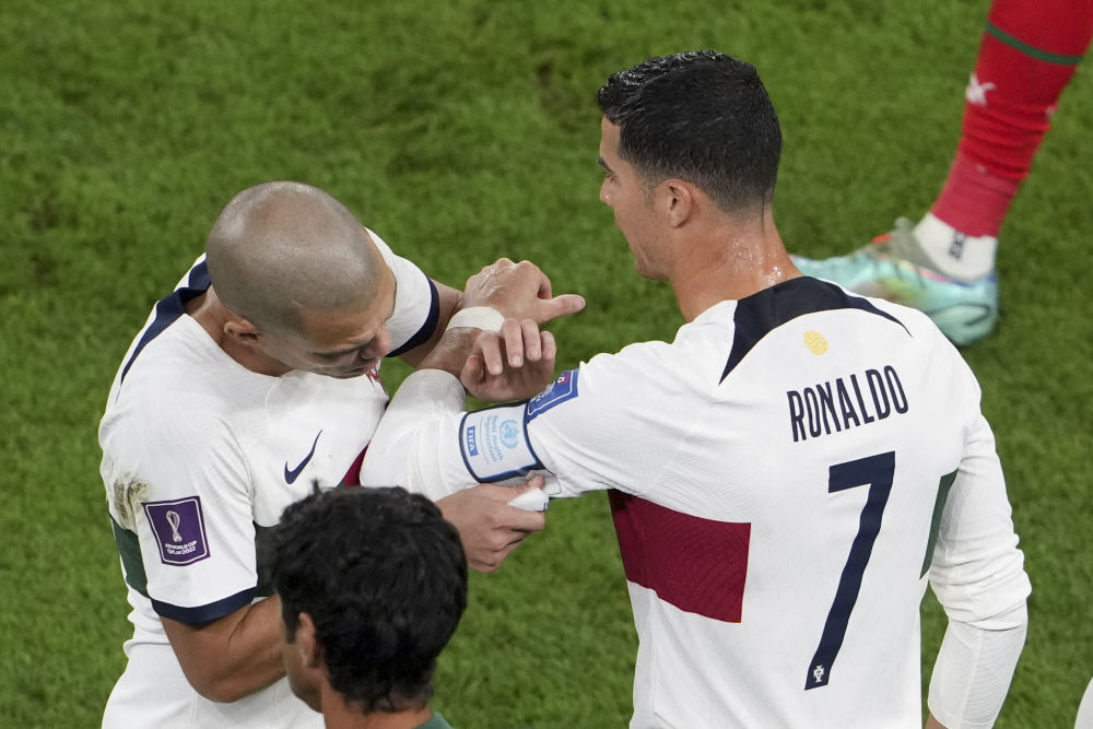 12月10日,葡萄牙队球员佩佩(左)在比赛中为队友C罗佩戴队长袖标。新华社记者 郑焕松 摄