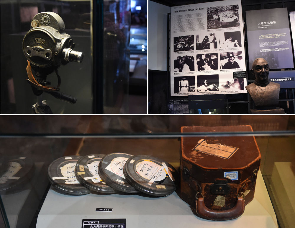 左上图:南京安全区国际委员会委员、美国牧师约翰·马吉拍摄南京大屠杀暴行所用的电影摄影机;下图:约翰·马吉的胶片盒等文物;右上图:约翰·马吉塑像及1938年5月美国《生活》杂志刊登的10幅由约翰·马吉胶片翻拍的南京大屠杀照片。(拼版照片) 新华社记者 孙参 摄