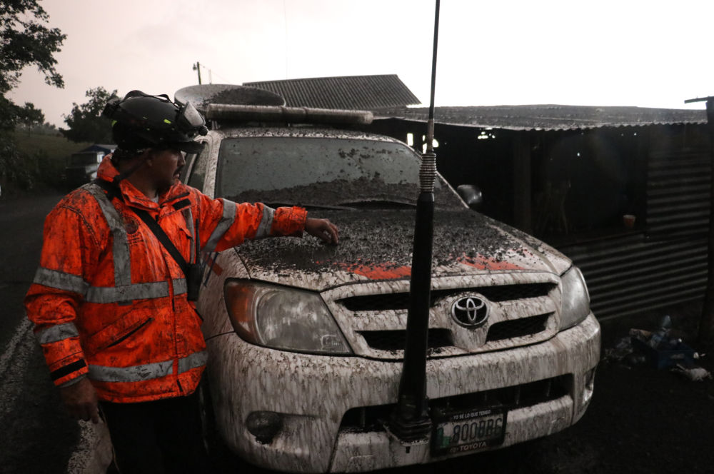 2018年6月3日,在危地马拉奇马尔特南戈省的阿卡特南戈,一名救援人员站在落满火山灰的车辆旁。新华社发