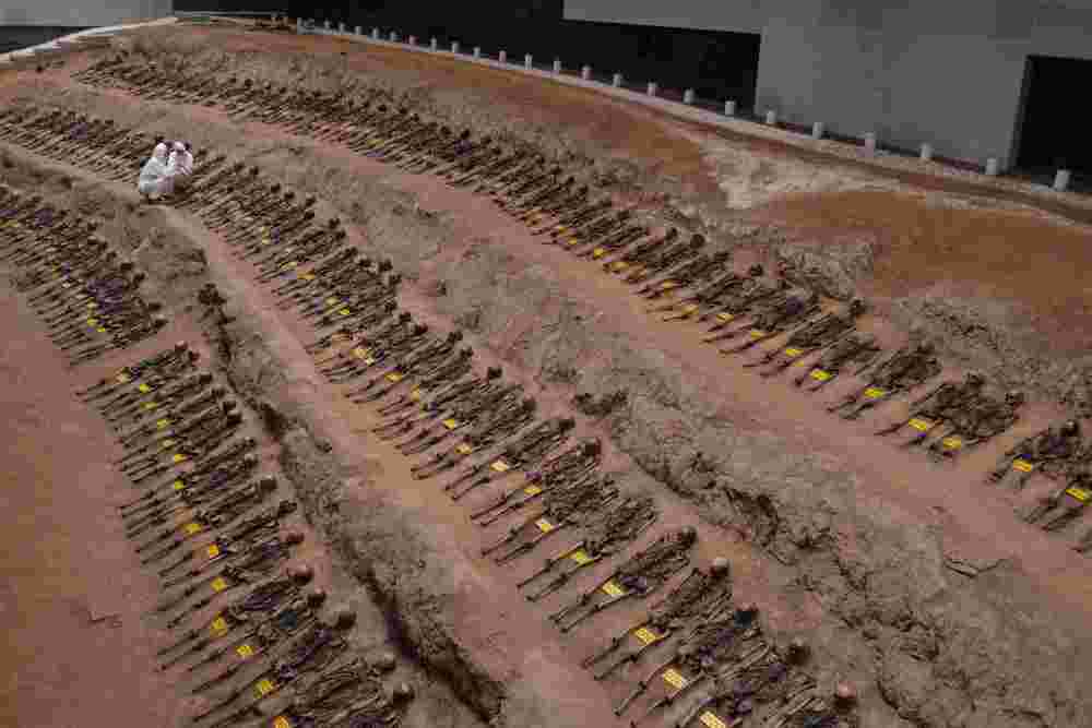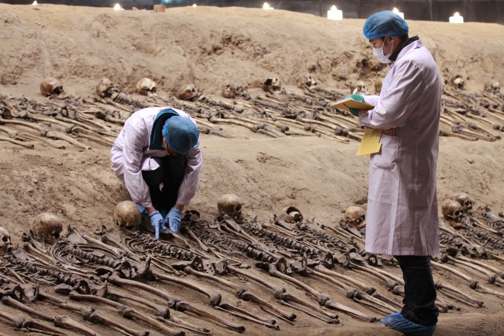 科研人员在对辽源矿工墓陈列馆内的“万人坑”内骸骨进行检查、登记工作。(受访者供图)