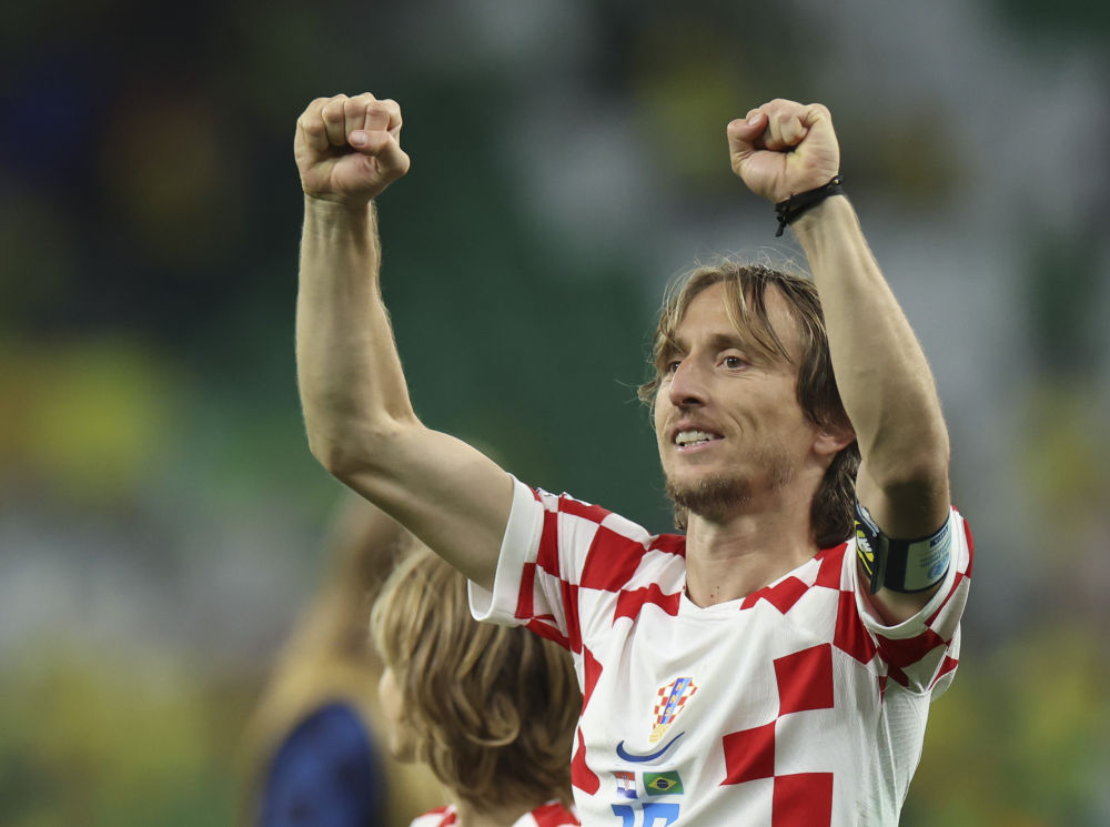 12月9日,卡塔尔世界杯足球赛四分之一决赛中,克罗地亚队通过点球大战战胜巴西队。图为克罗地亚队球员莫德里奇在比赛后庆祝胜利。新华社记者李明摄
