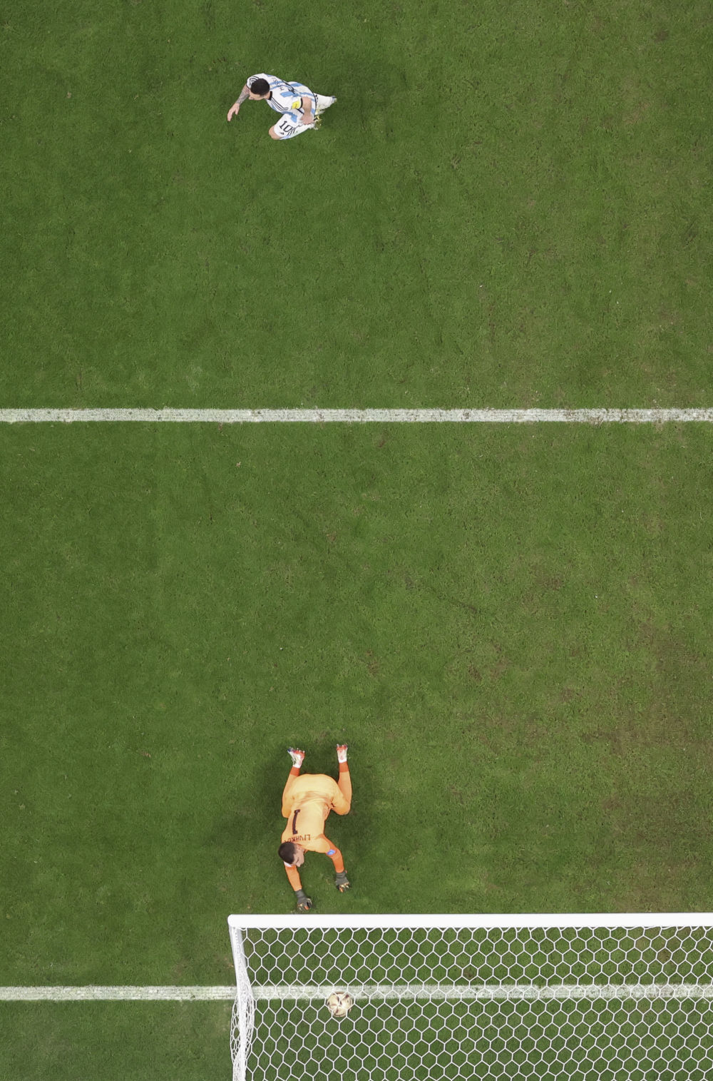 12月13日,克罗地亚队守门员利瓦科维奇(下)在比赛中未能扑出梅西主罚的点球。新华社记者 徐子鉴 摄