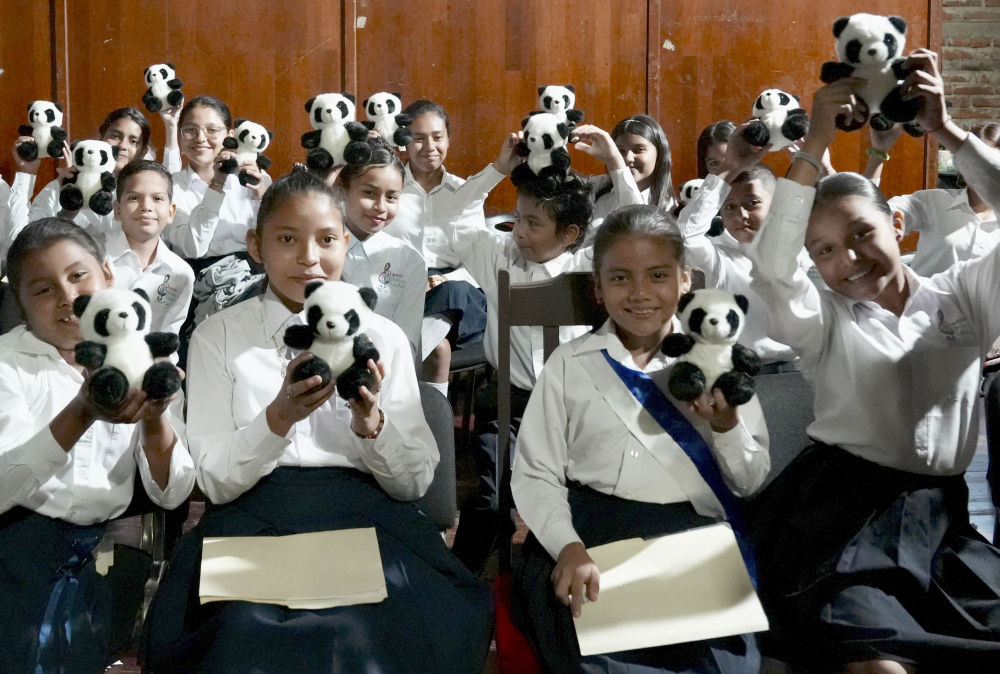12月8日,在位于尼加拉瓜首都马那瓜的国家剧院,参加庆祝中尼复交一周年专场音乐会的学生手捧熊猫玩偶。新华社记者 席玥 摄