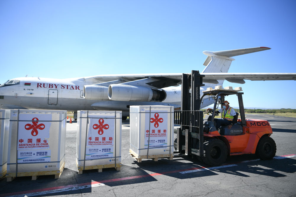 2021年12月24日,在尼加拉瓜马那瓜国际机场,工作人员转运由中国国药集团生产的新冠疫苗。新华社记者 辛悦卫 摄