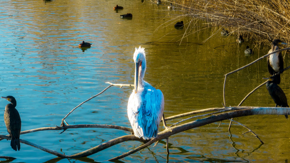 卷羽鹈鹕在湖岸边的树枝上梳理羽毛。(张学锋摄)