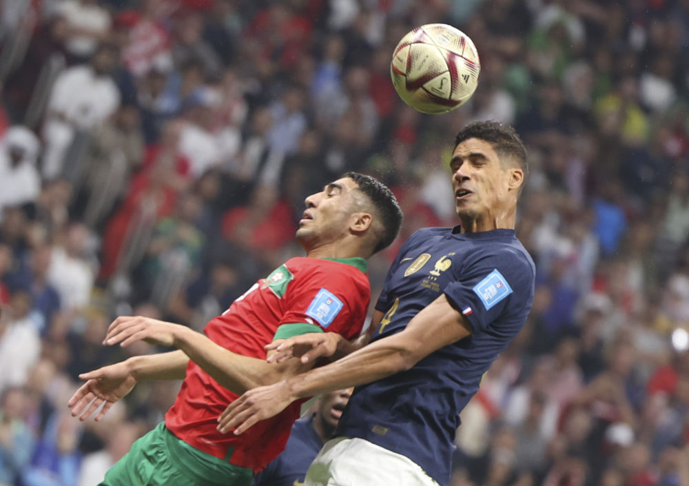 12月14日,法国队球员瓦拉内(右)与摩洛哥队球员阿什拉夫在比赛中争顶。新华社记者曹灿摄