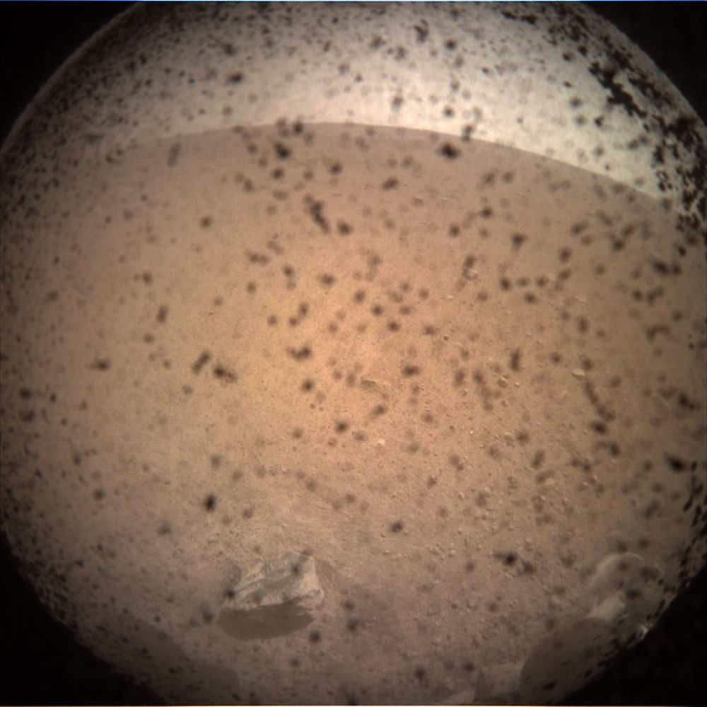 这张美国航天局2018年11月26日提供的画面显示“洞察”号无人探测器传回的火星首张照片。新华社发(美国航天局供图)