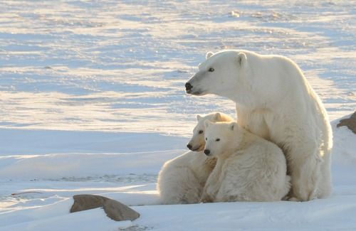 这张2011年2月9日发布的照片显示一只雌性北极熊带着两只幼崽在加拿大丘吉尔镇附近生活。新华社/路透