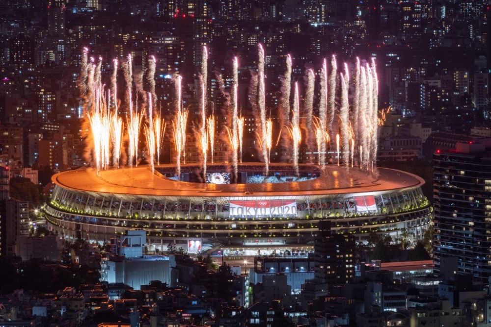 2021年7月23日,第32届夏季奥林匹克运动会开幕式在日本东京举行。这是新国立竞技场上空燃放的焰火。(新华社记者徐子鉴摄)