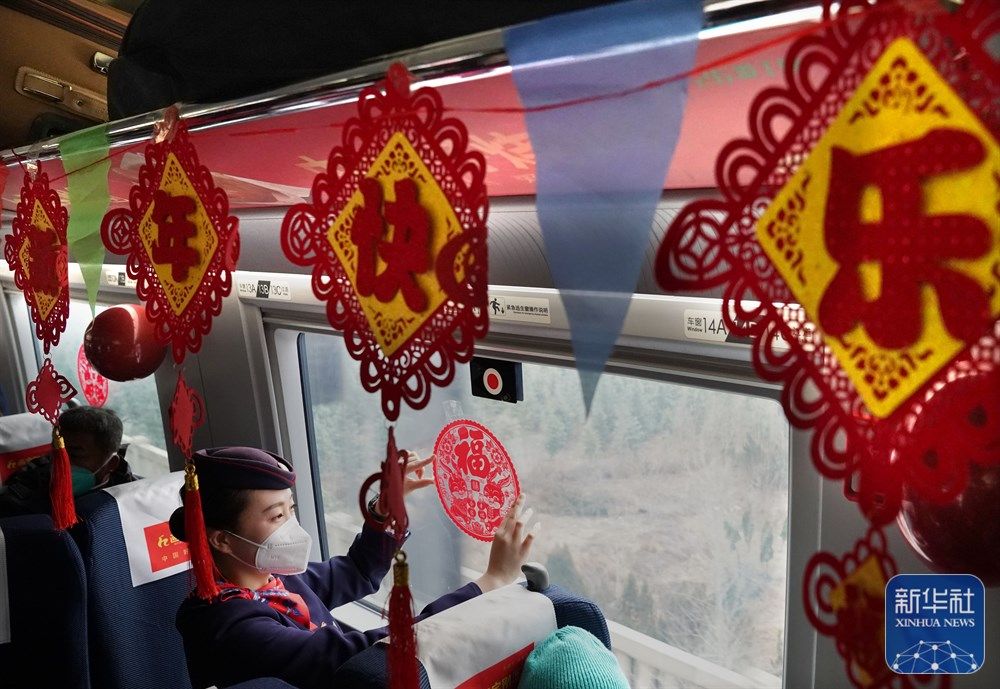 1月1日,列车工作人员在G2023次高铁列车车厢内贴窗花。新华社记者 李安 摄