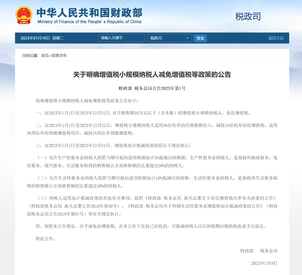公告提出,自2023年1月1日至2023年12月31日,对月销售额10万元以下(含本数)的增值税小规模纳税人,免征增值税。