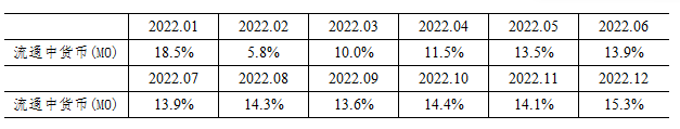 注4:自2022年12月起,“流通中货币(M0)”含流通中数字人民币。12月末流通中数字人民币余额为136.1亿元。修订后,2022年各月末M1、M2增速无明显变化。修订后M0增速如下: