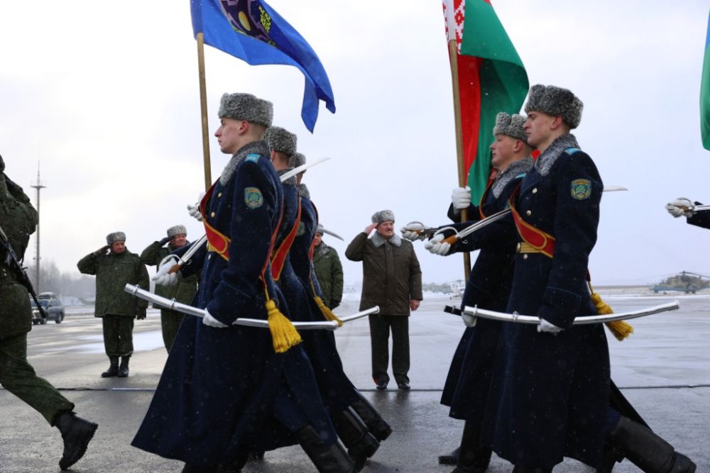 2022年1月15日,白俄罗斯总统卢卡申科(后中)在明斯克的军用机场检阅部队。新华社发(白俄罗斯总统网站供图)