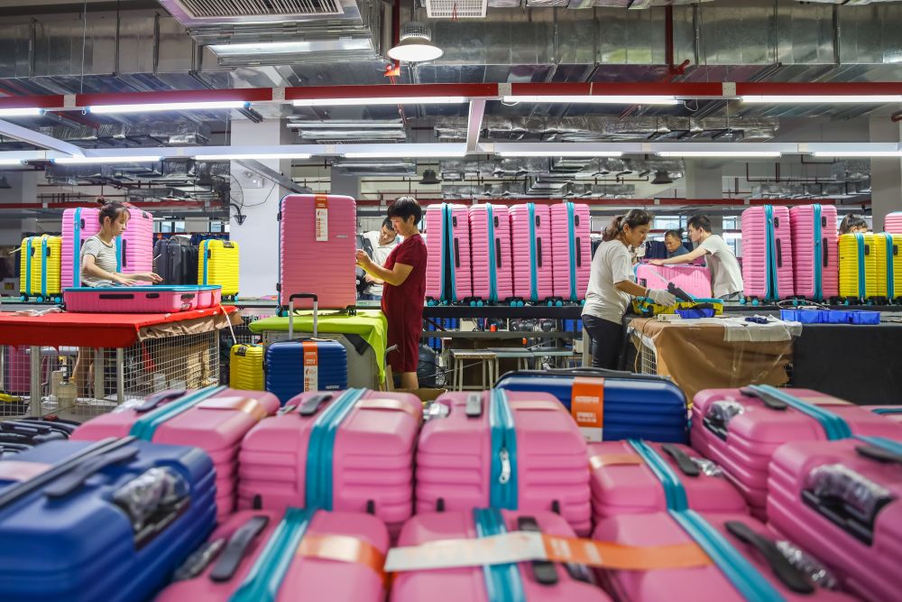 2022年9月29日,在湖南省永州市蓝山县皮具箱包科技产业园湖南揽胜科技有限公司,工人在组装一批出口箱包。(彭华 摄)