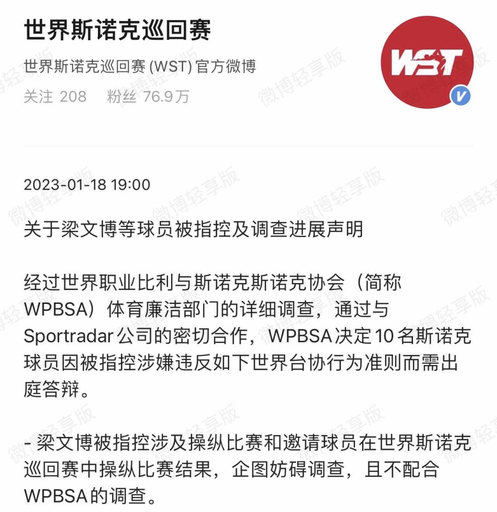 梁文博等10名中国斯诺克球员涉嫌以赌球为目的操纵比赛结果事件有了最新进展,世界职业台球和斯诺克协会(世台联)北京时间18日发布声明称,这10名球员将需出庭答辩。
