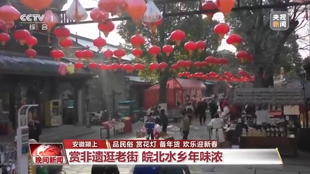 多彩民俗,热闹非凡。在有着皖北水乡之称的安徽颍上县,大红灯笼将老街装扮一新,国家级非物质文化遗产花鼓灯节目热闹上演,人们在采买年货的同时,还可以欣赏民俗表演。