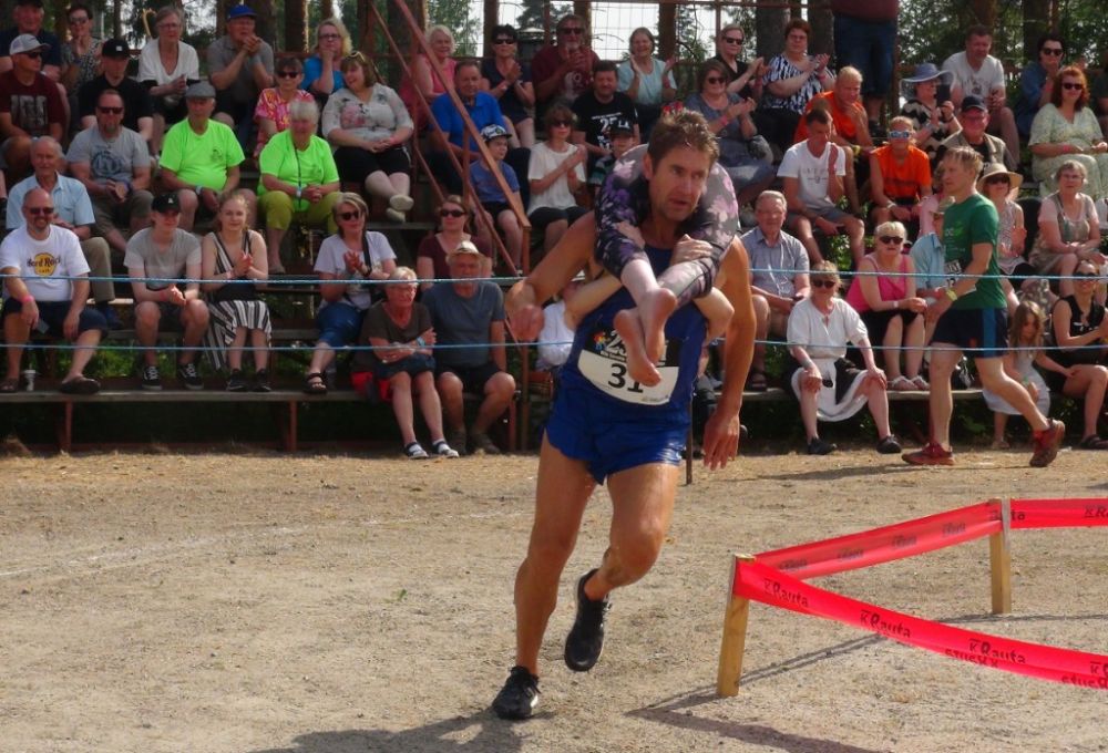 2022年7月2日,选手在芬兰松卡耶尔维参加趣味“背妻大赛”。新华社记者 陈静 摄