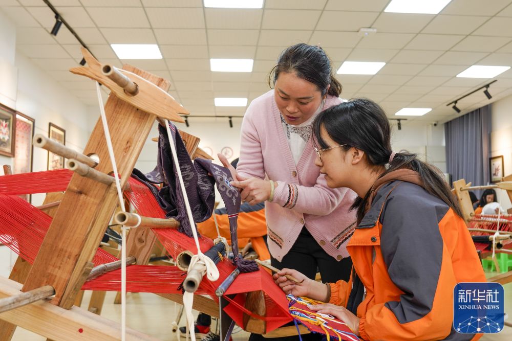 10月27日,重庆市黔江区民族职业教育中心的学生在老师(左)的指导下进行西兰卡普(土家语,意为土花铺盖)织锦练习。新华社记者 刘潺 摄
