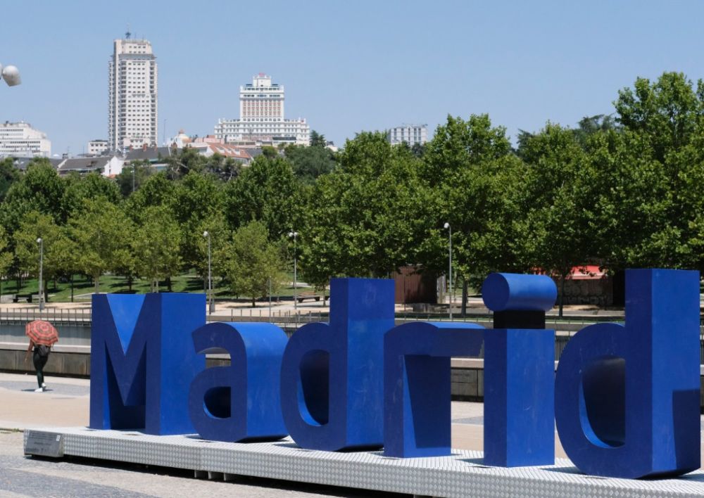 2022年7月20日,一名市民撑伞走过西班牙马德里曼萨纳雷斯河边。新华社记者 孟鼎博 摄
