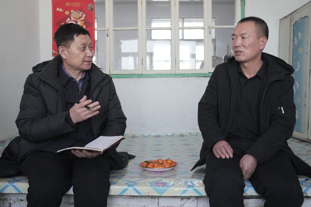 2月14日,孙斌(左)在黑龙江省桦南县明义乡清茶村村民罗士金家了解情况。新华社记者 王建威 摄