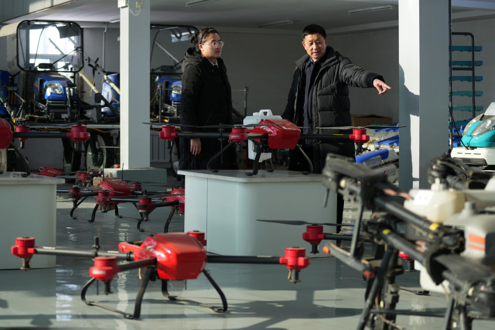 2月14日,孙斌(右)在黑龙江省桦南县鸿源水稻专业合作社的现代水田农机展示区介绍无人机使用情况。新华社记者 王建威 摄