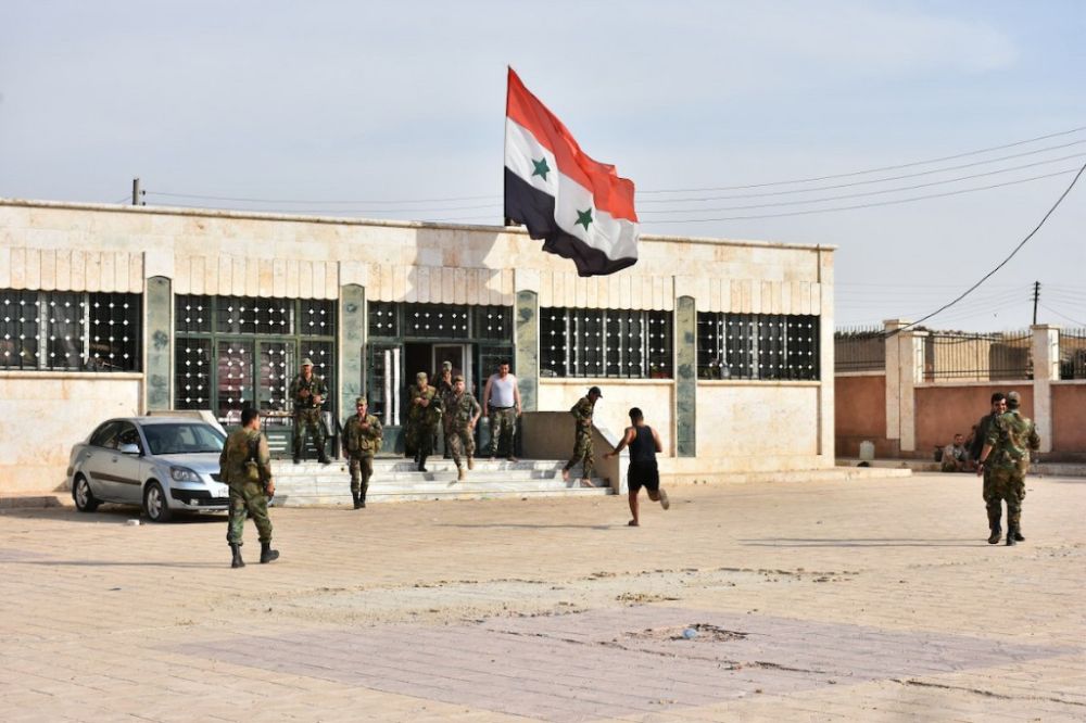 2019年10月15日,在叙利亚北部曼比季,叙利亚政府军士兵进驻一处军事基地。新华社发