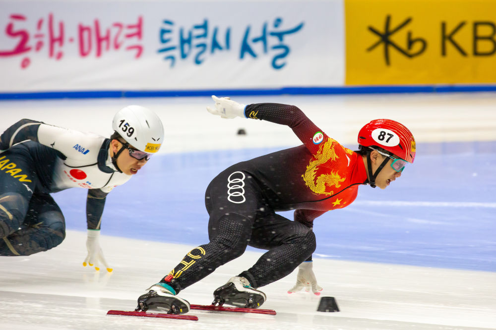 3月10日,中国选手李文龙(右)在比赛中。当日,在韩国首尔进行的2023年短道速滑世锦赛男子1500米四分之一决赛中,中国选手李文龙以2分14秒298的成绩晋级半决赛。新华社记者 王益亮 摄