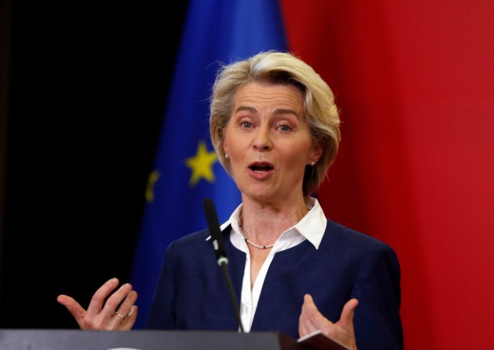 2022年10月26日,在北马其顿斯科普里,欧盟委员会主席冯德莱恩在与北马其顿总理科瓦切夫斯基(不在画面中)举行的联合新闻发布会上讲话。新华社发(托米斯拉夫·格奥尔基耶夫摄)