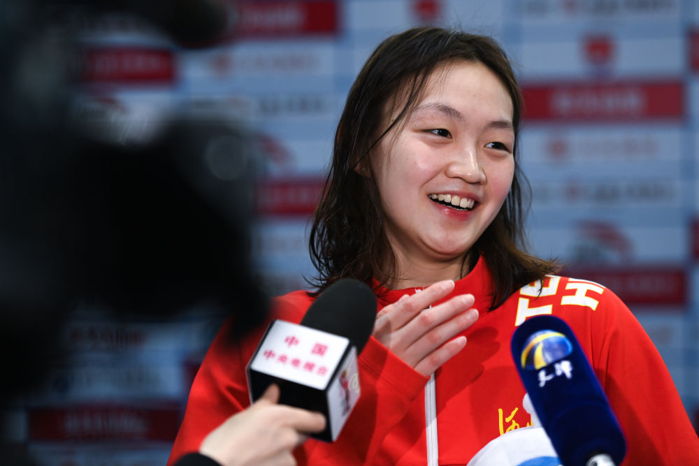 3月21日,李冰洁在女子400米自由泳颁奖仪式后接受采访。新华社记者 夏一方 摄