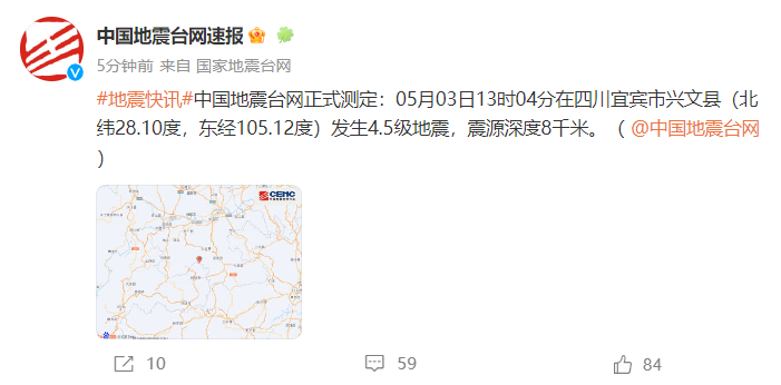 中国地震台网正式测定:5月3日13时4分在四川宜宾市兴文县(北纬28.10度,东经105.12度)发生4.5级地震,震源深度8千米。