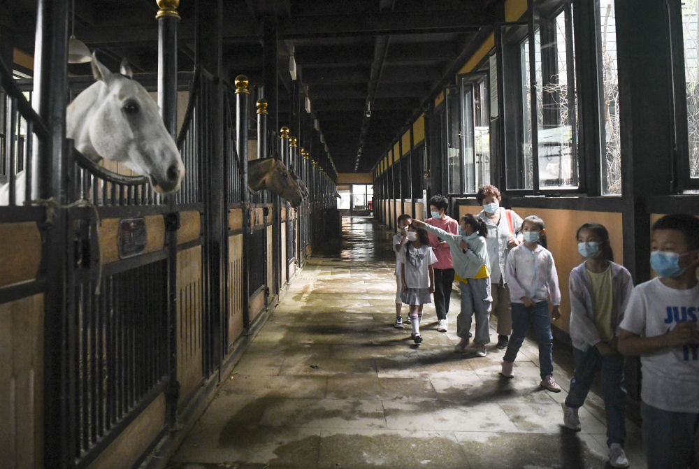在新疆古生态园汗血马基地,几名小朋友在导游的介绍下观察汗血马(2022年6月16日摄)。 新华社记者 王菲 摄